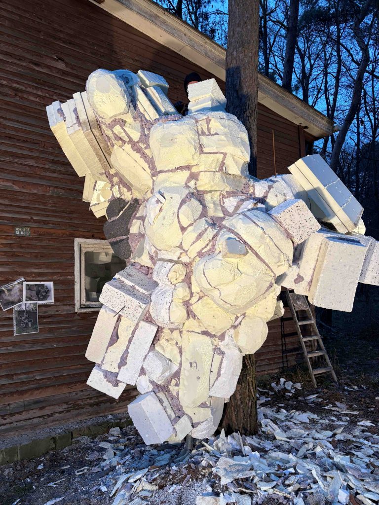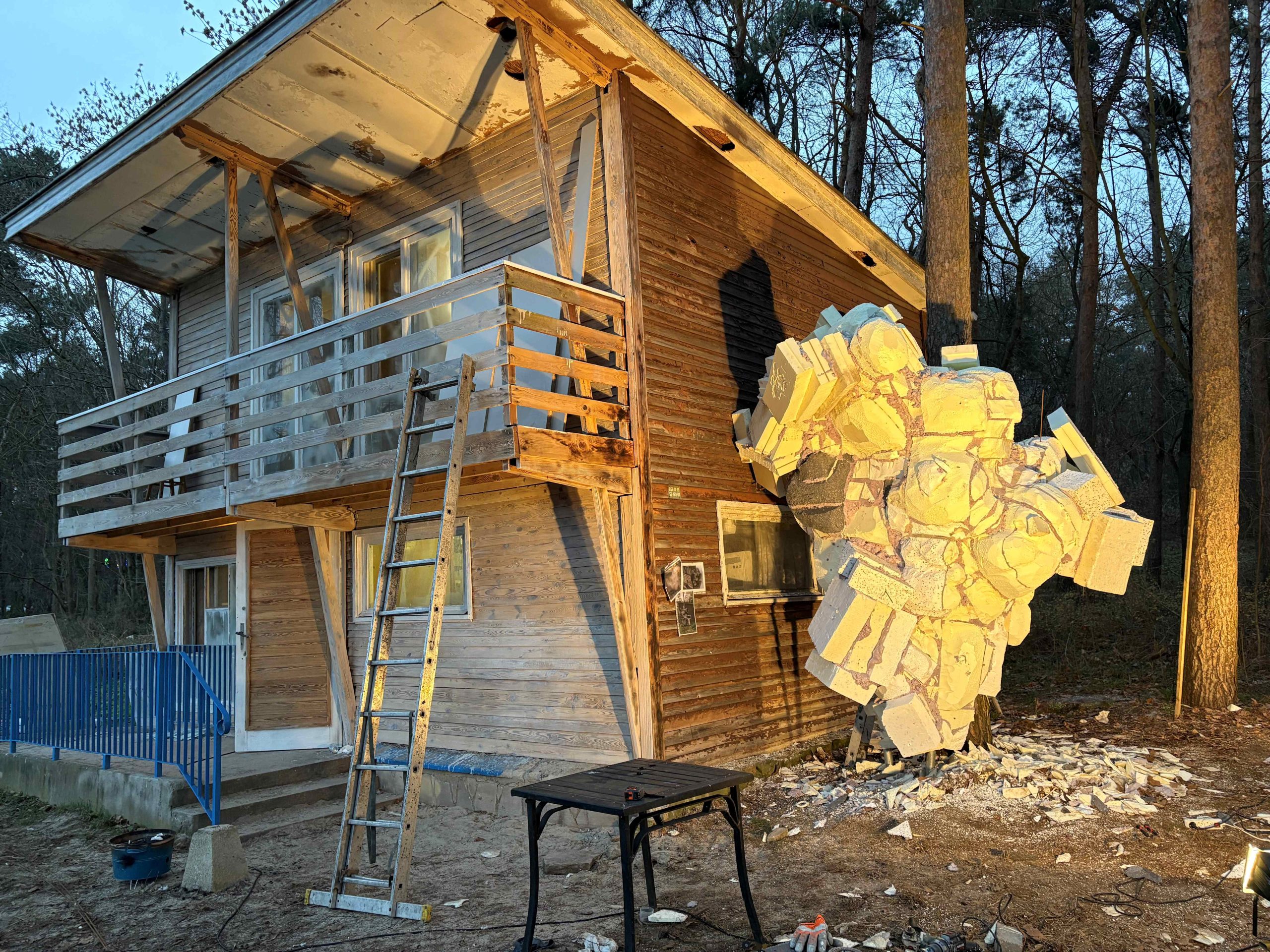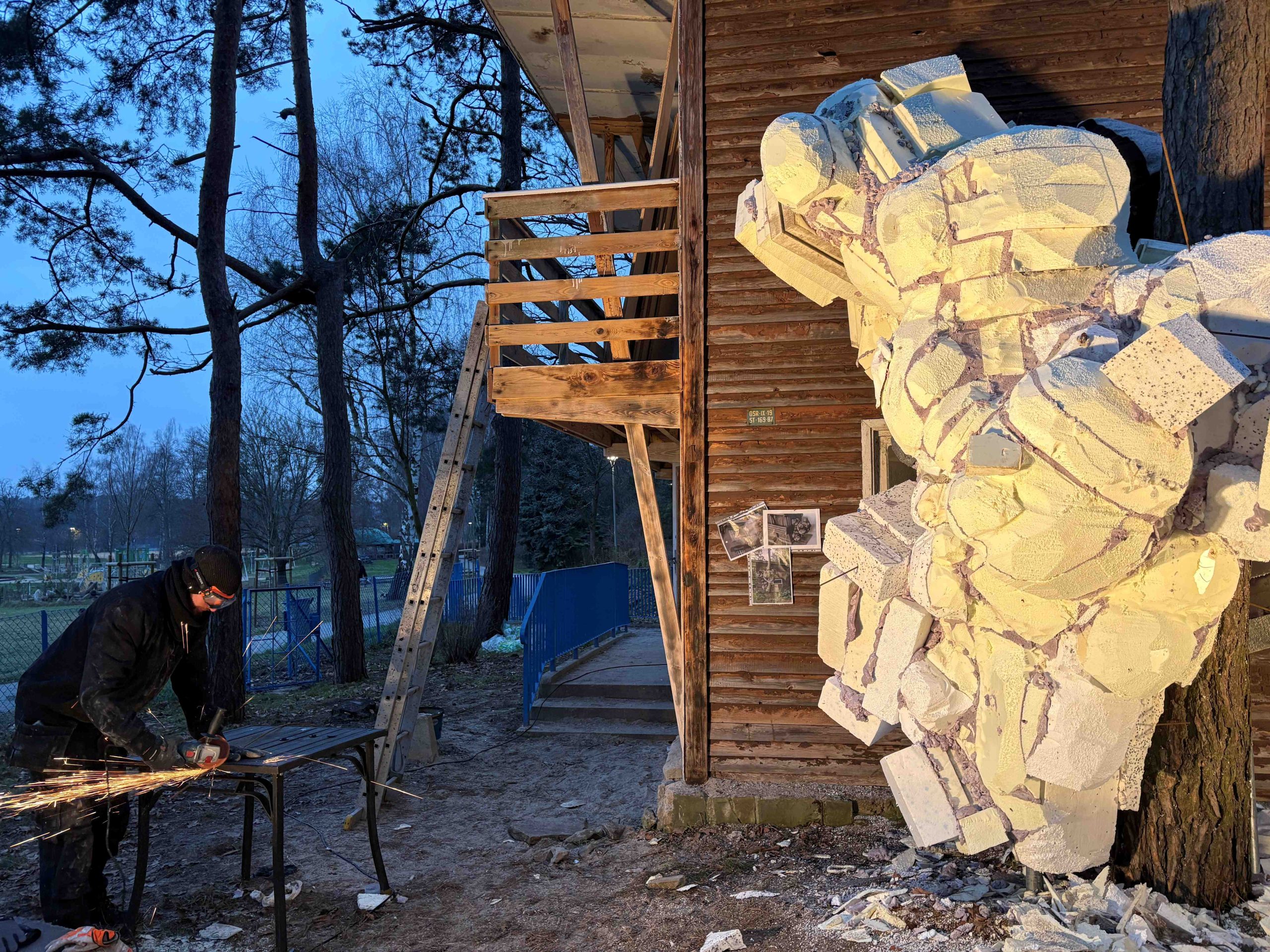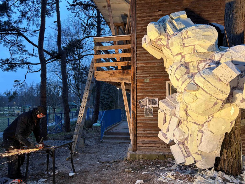 Trwają kolejne etapy pracy nad instalacją „Letnisko” Jerzy Norkowski koncentruje się na formowaniu obiektu. To etap intensywnej pracy, w której pojawiają się kolejne kształty i detale, obiekt coraz silnie zaznacza swoją obecność w przestrzeni.